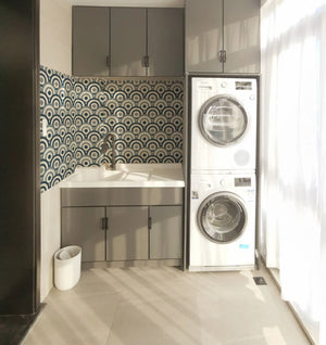• 【Diseño】 Estilo azulado, el color de fondo blanco y círculos en muchos tonos de azul. El mosaico utiliza círculos explosivos e incluso degradados suaves; Este elegante anillo es sinónimo de estilo moderno y dinámico. Azulejos cuadrados de unión cerrada con borde biselado transparente procesado, no requiere lechada, este diseño con costuras lo hace como un azulejo calafateado real.