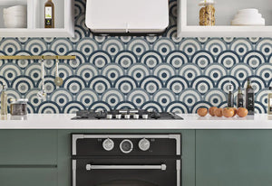 A renovated kitchen featuring Colamo Blue Ring glossy peel and stick backsplash, reflecting under-cabinet lighting behind a copper kettle.