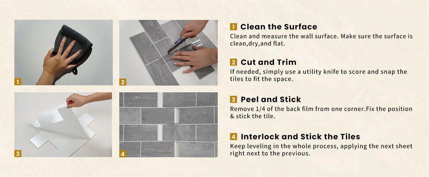 • Instalación en seco sobre cualquier superficie lisa y limpia: fácil bricolaje, simplemente despegue y pegue. Hecho de baldosas de vinilo SPC de última actualización. Respetuoso con el medio ambiente, más fácil de instalar y mantener que las baldosas tradicionales, tiene una vida útil más larga. Sin lechada, sin ensuciar. Se limpia con un paño y es fácil de cuidar.
