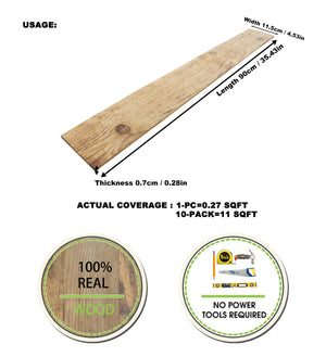 - Especificaciones: Cada panel de madera recuperada mide 35,43 x 4,53 x 0,28 pulgadas, 10 piezas cubren 11 pies cuadrados. Nuestros paneles de pared 3D vienen en una variedad de acabados. La ligera variación en color y tono es la singularidad de la madera natural, que brinda profundidad y riqueza como si estuviera hecha a mano por un artesano.