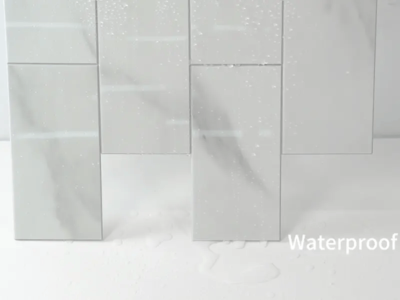 A: Our tiles are waterproof, but the adhesive isn't. Water will not infiltrate from the surface. Unless doing waterproofing treatment on the installed or grouted wall, we don't recommend sticking on the area which immerse in water or with high water flush.