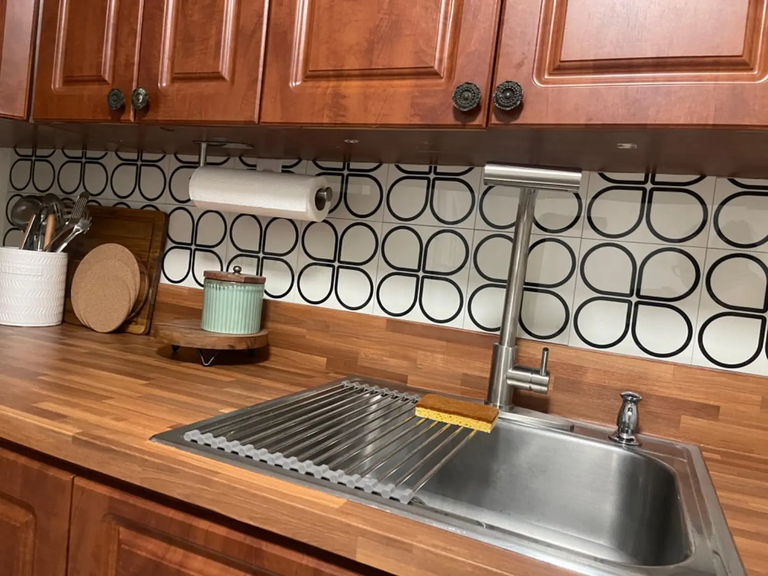 Peel and Stick tiles, Bathroom vanity with sink, mirror, and decorative elements.