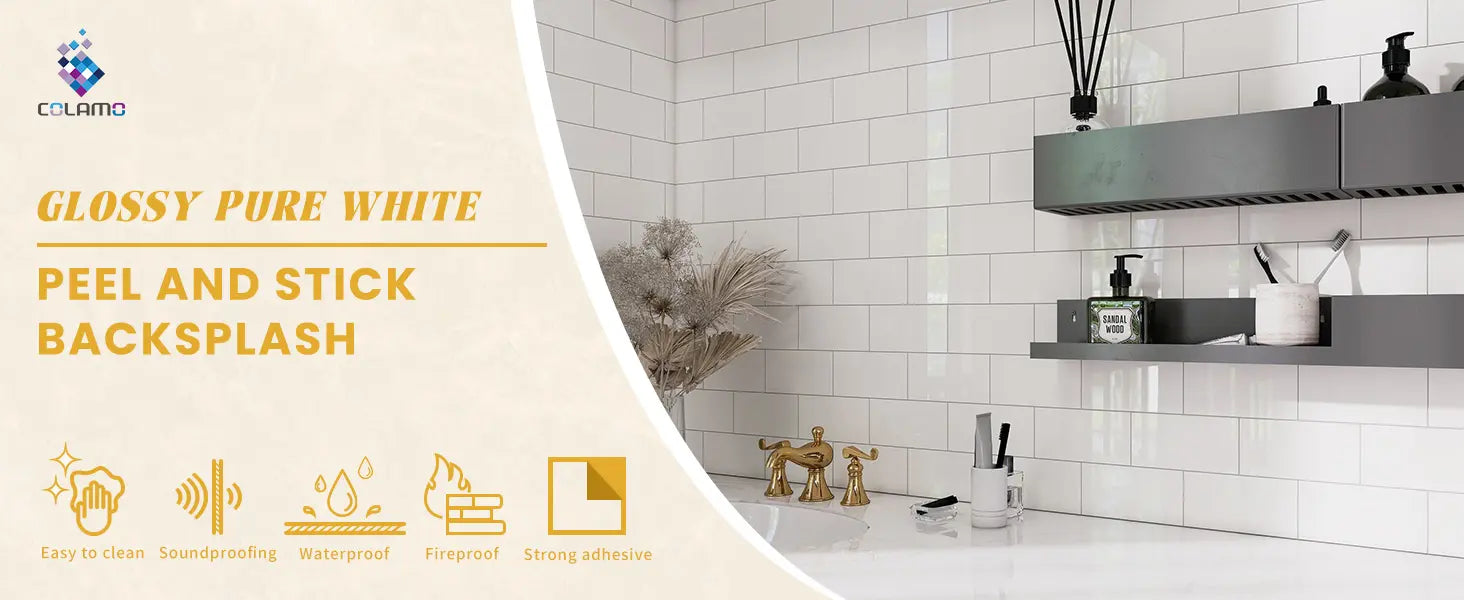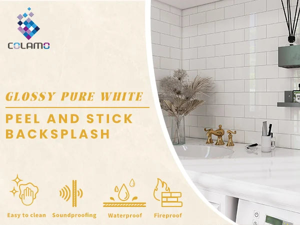 COLAMO 12"x12" Glossy Pure White Peel and Stick Backsplash Subway Tiles For Wall