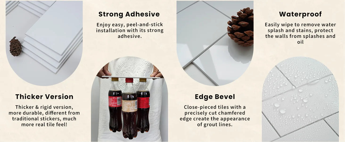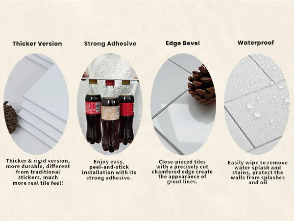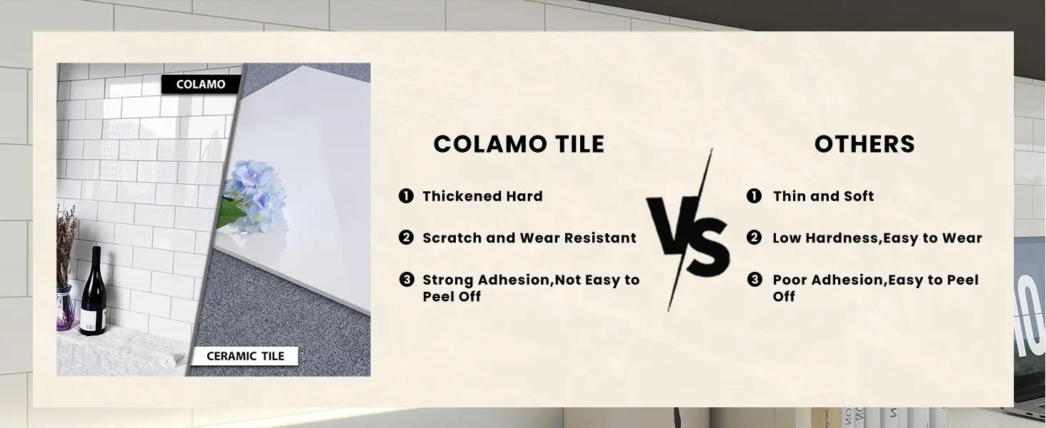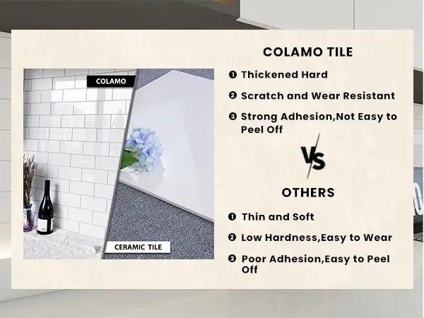 - ใPremium FeaturesใThese kitchen backsplashes are made of stone composite material. Compared to other peel stick vinyl tiles, wall stickers and panels, COLAMO LUXURY tiles are much thicker and rigid, and therefore more durable. The tiles are waterproof, oil resistant and heat resistant. Easy to clean and maintain.It is a very beautiful and cost-effective decorative tile for refreshing your home