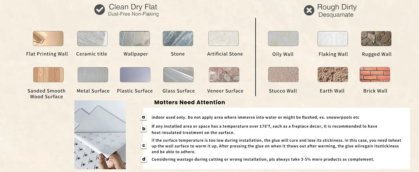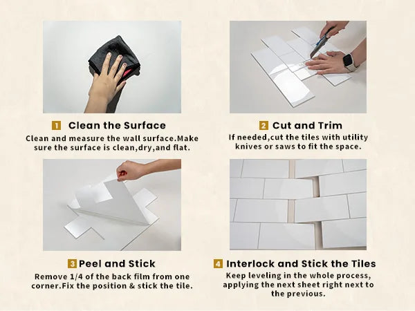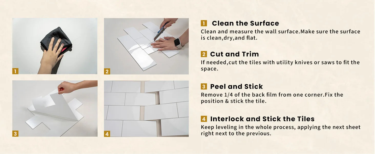 - ใInstallation TipsใThe wall tile is easy to install, just peel its back tape and stick it on. For trimming, just use a utility knife or box cutter to cut open a line from either surface or back and snap to break off (use chainsaw if necessary) This tile can be used in a various scenes, such as kitchen, bathroom, bedroom and living room backsplashes, also can be nice wall decoration for fireplace, doorway, entrance accent. But only for interior decoration, and shower is not recommended