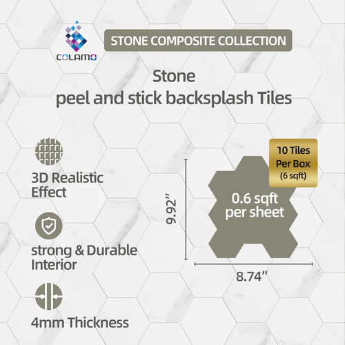 - 【Size & Package】Each tile is 9.92"x8.74" x 0.16”, 5 pieces cover 3 square feet and 10 pieces cover 6 square feet. We always recommend taking 5-10% more due to concerns about installation losses.